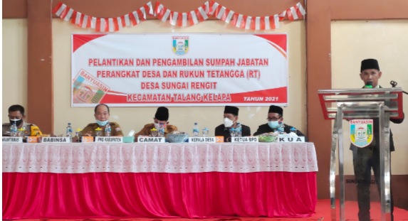 Banyuasin, Orbitnews.co.id- Acara pelaksanaan pelantikan / pengambilan sumpah jabatan perangkat desa dan RT yang bertempat di gedung pemuda lingkungan kantor desa sungai rengit kec. talang kelapa kab. Banyuasin / Sumsel. tgl. 31/8/2021