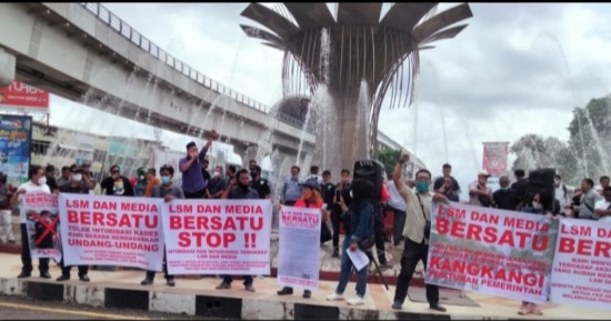 Ratusan Gabungan koalisi LSM , Ormas dan Pers melakukan aksi unjuk rasa dibundaran air mancur Palembang.
